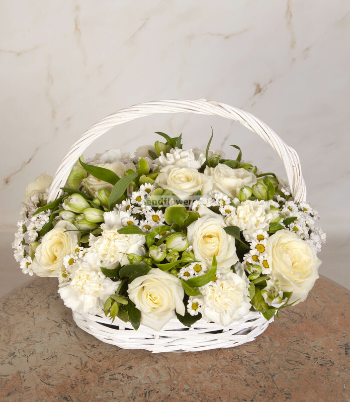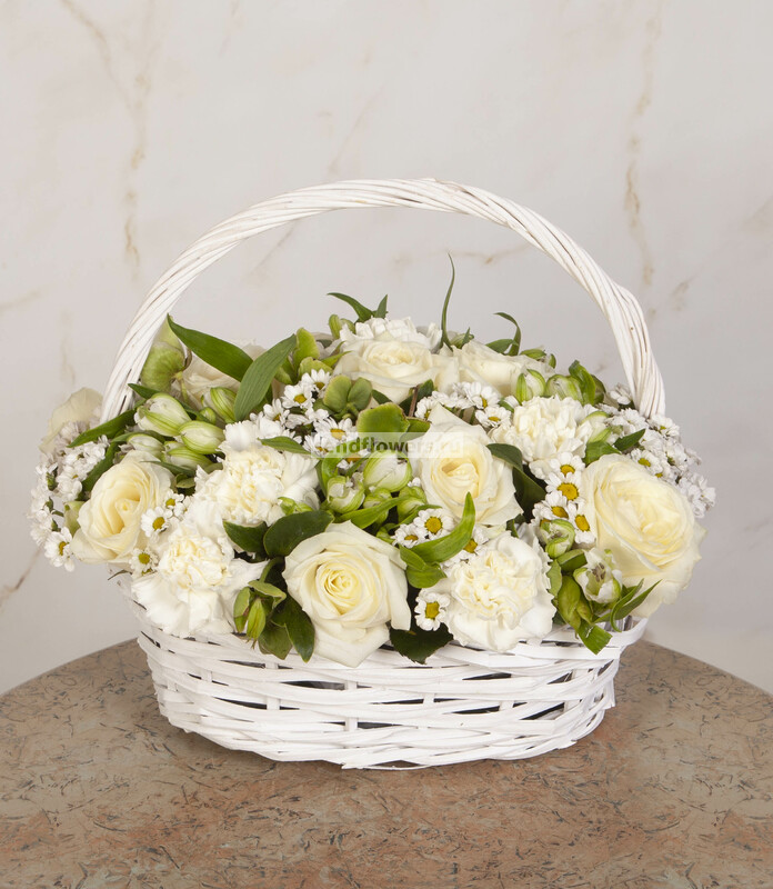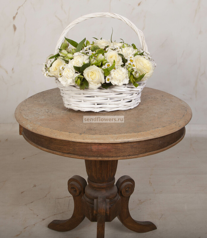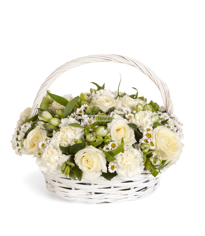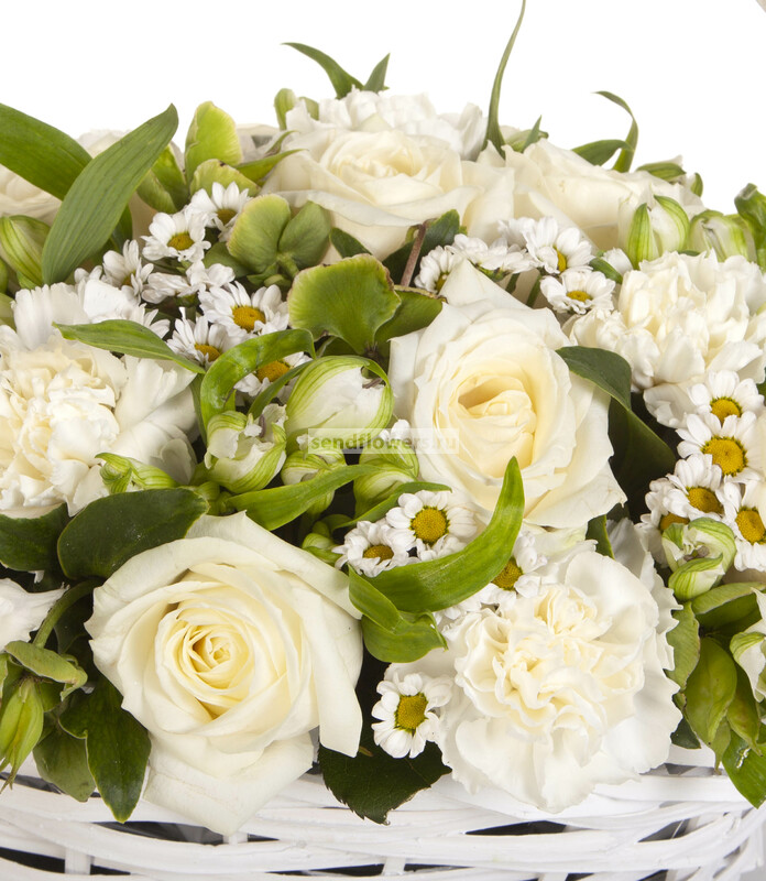 Состав: Оазис кирпич (2), Корзина малая (1), Хелеборус белый (3), Фисташка (3), Альстромерия белая (5), Роза белая (10), Гвоздика белая (7), Хризантема Сантини белая (5)